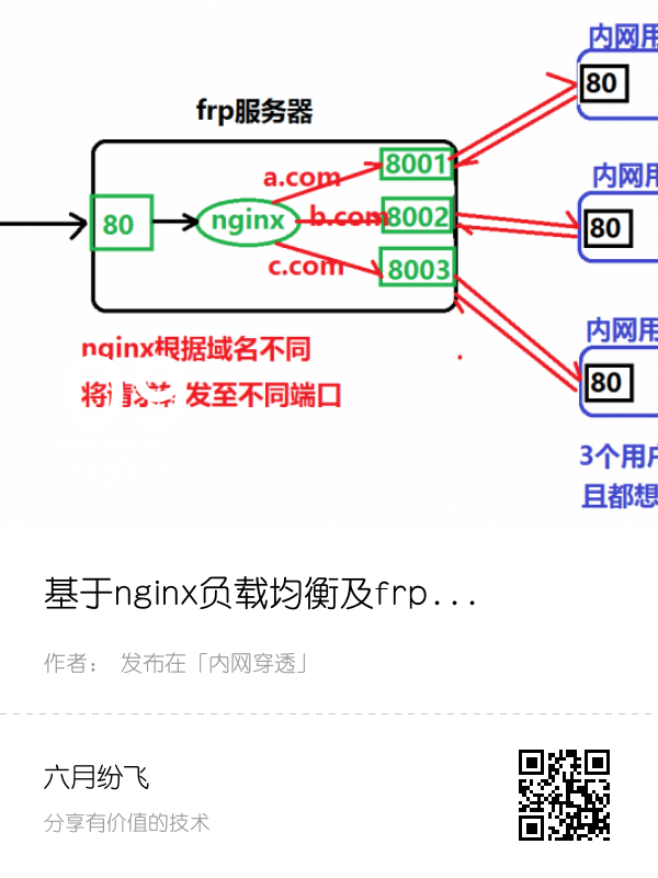 框架大概是这样:假设不同用户的内网80端口分别转发至服务器的8001、8002、8003·····他们各自的域名分别为a.com 、 b.com 、c.com然后我告诉nginx,有人请求访问a.com了,你就去找8001端口;有人访问b.com了,你就去找8002······以此类推。